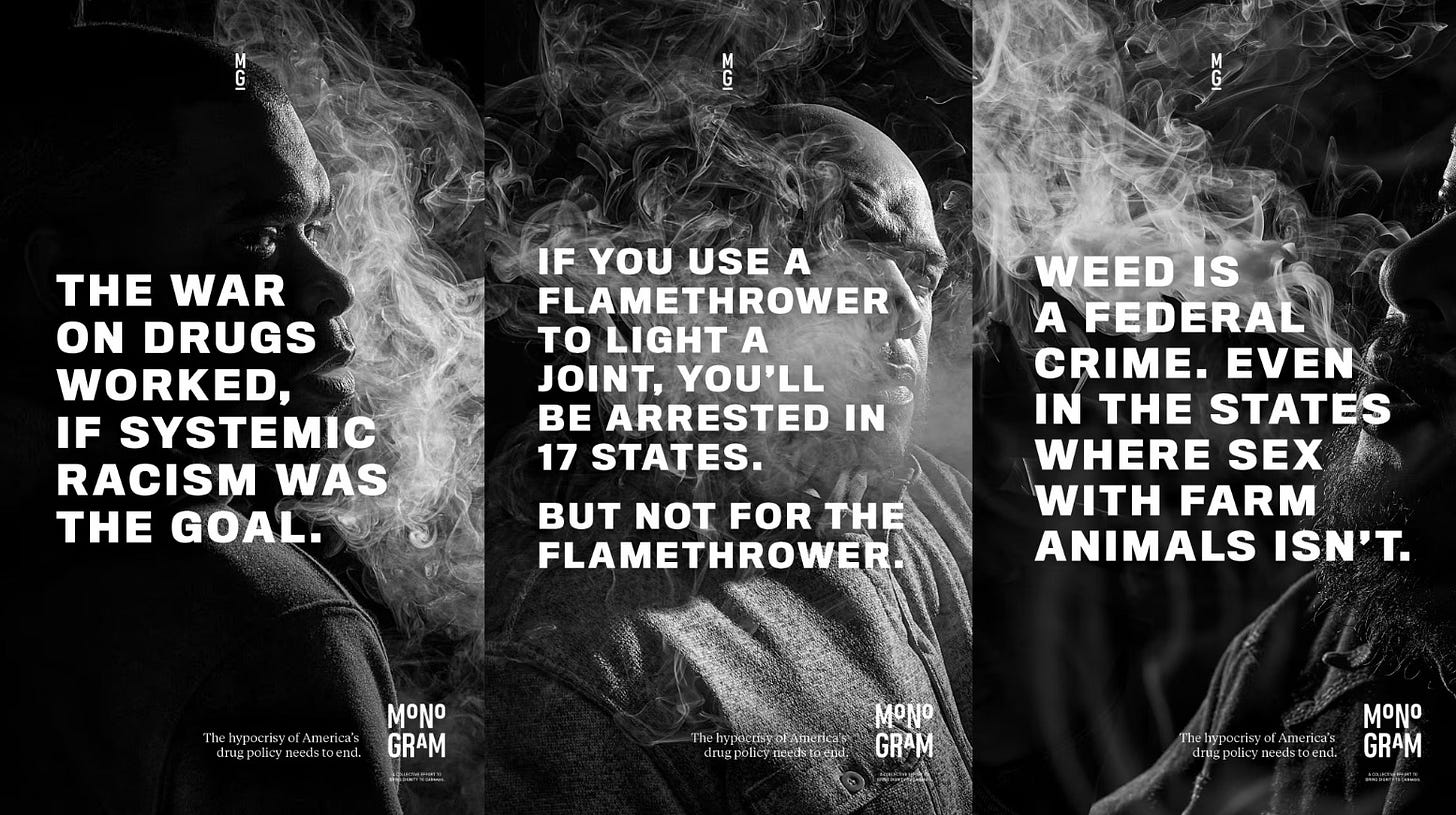 Tinder’s ‘it starts with a swipe’ reboot; Jay-Z’s cannabis brand Monogram launch (above). Heinz’s ‘Draw Ketchup’ experiment (when asked to ‘draw ketchup’, 97% of people drew Heinz). That Eos ‘bless your f–in cooch’ viral TikTok collab thing. Turning New York billboards into donation points for Ukrainian relief efforts). They frequently mash up advertising, stunts, social media and social experiments.