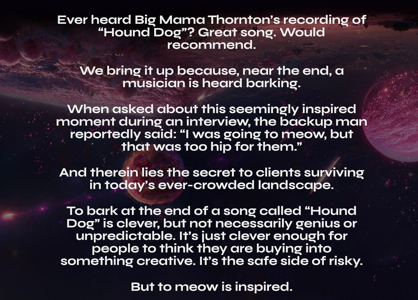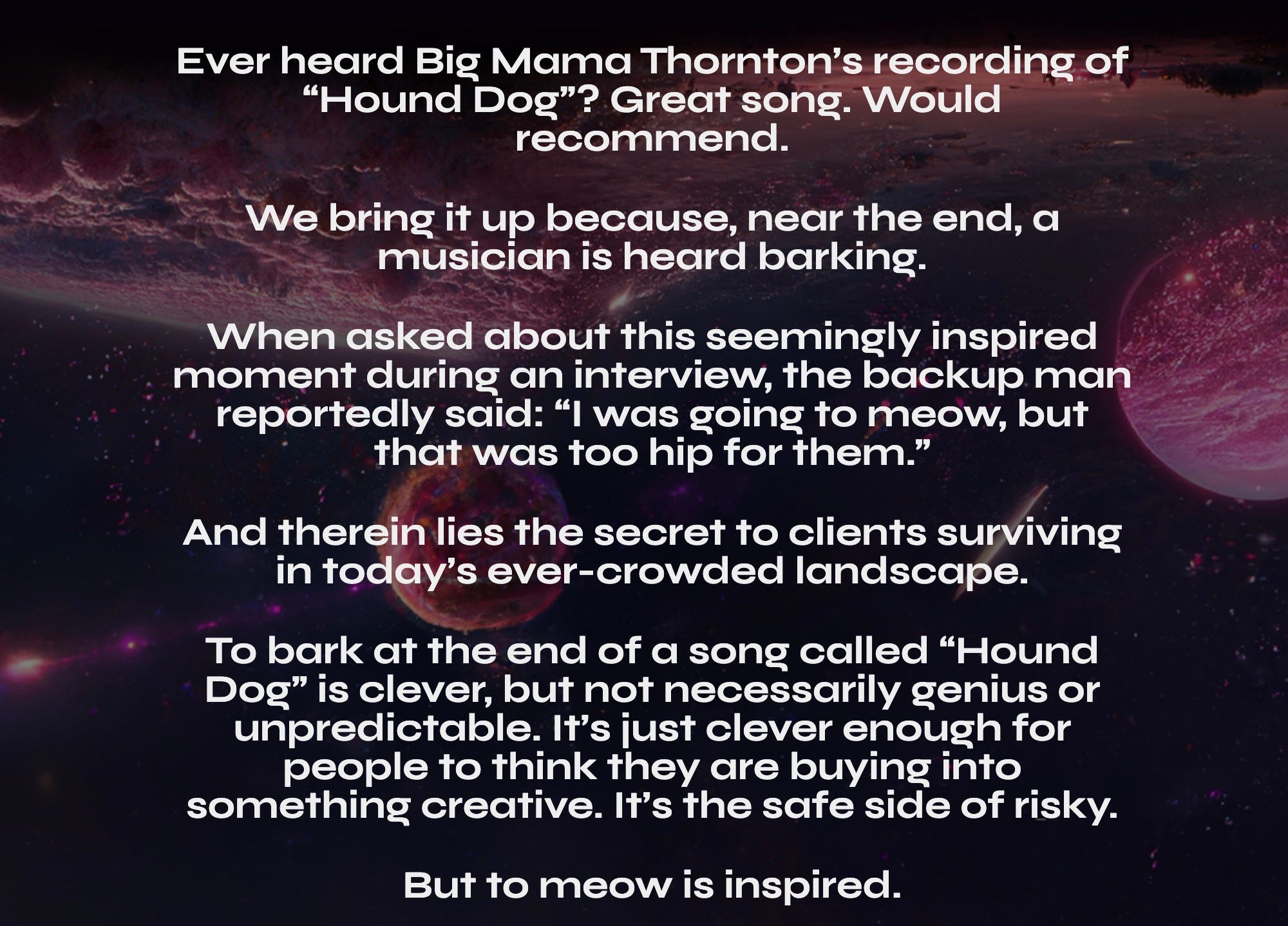 To bark at the end of a song called ‘Hound Dog’ is clever, but not necessarily genius or unpredictable. It’s just clever enough for people to think they are buying into something creative. It’s the safe side of risky.